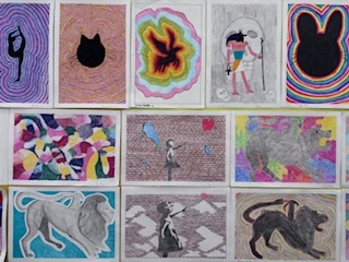 Gli elaborati spaziano tra molti soggetti e argomenti: rimandi alla storia dell’arte, cartoni animati di qualche tempo fa, varie tecniche grafico-pittoriche, ad esempio puntinismo e divisionismo.